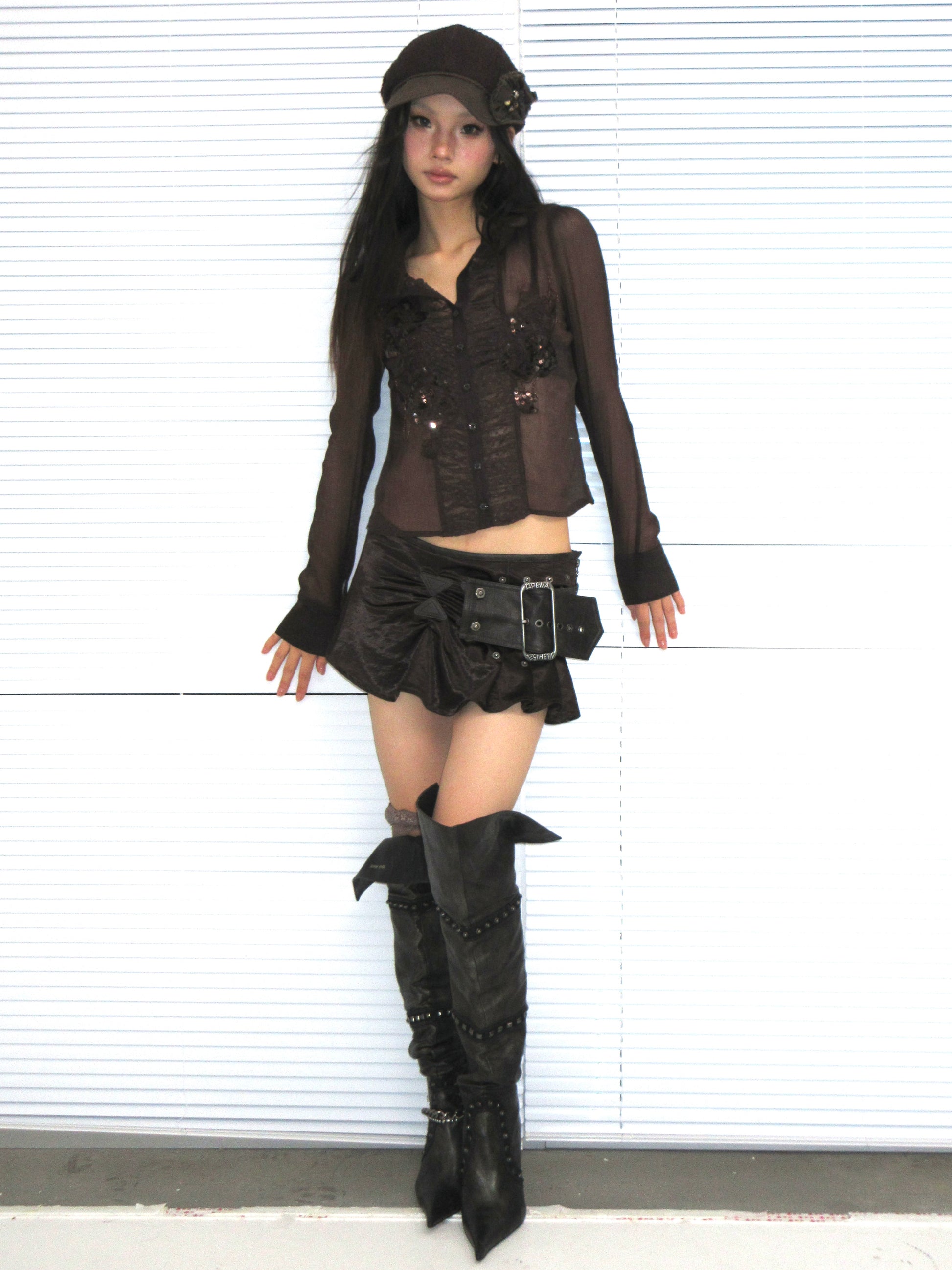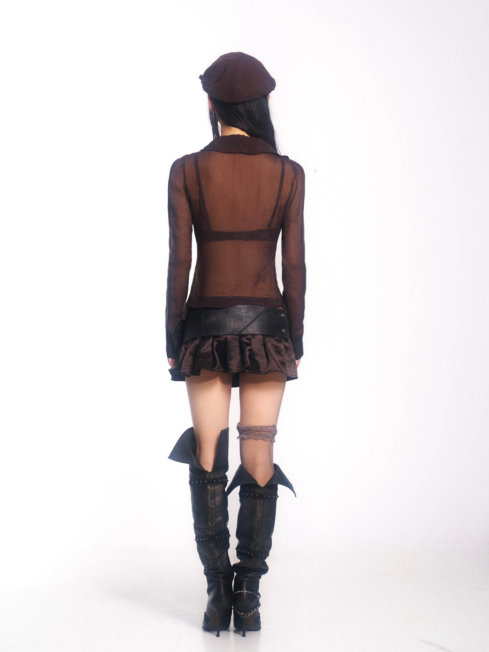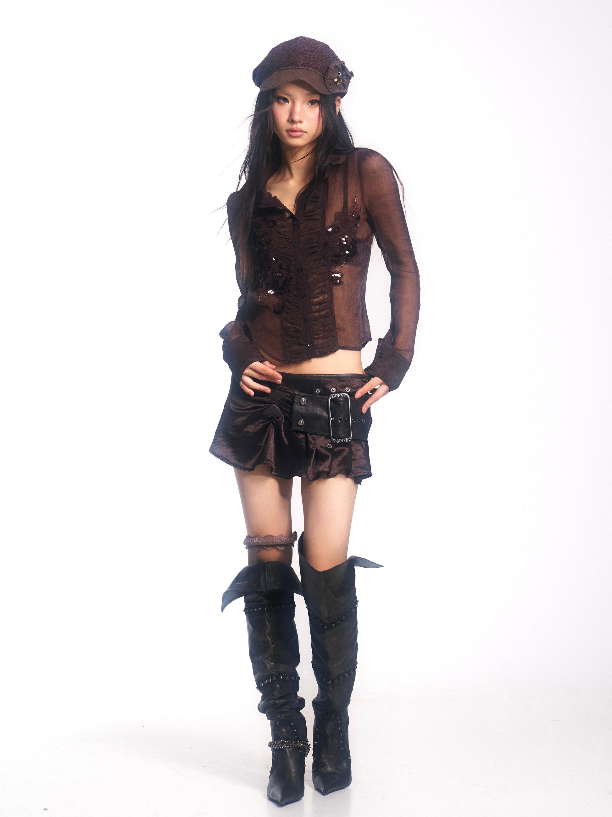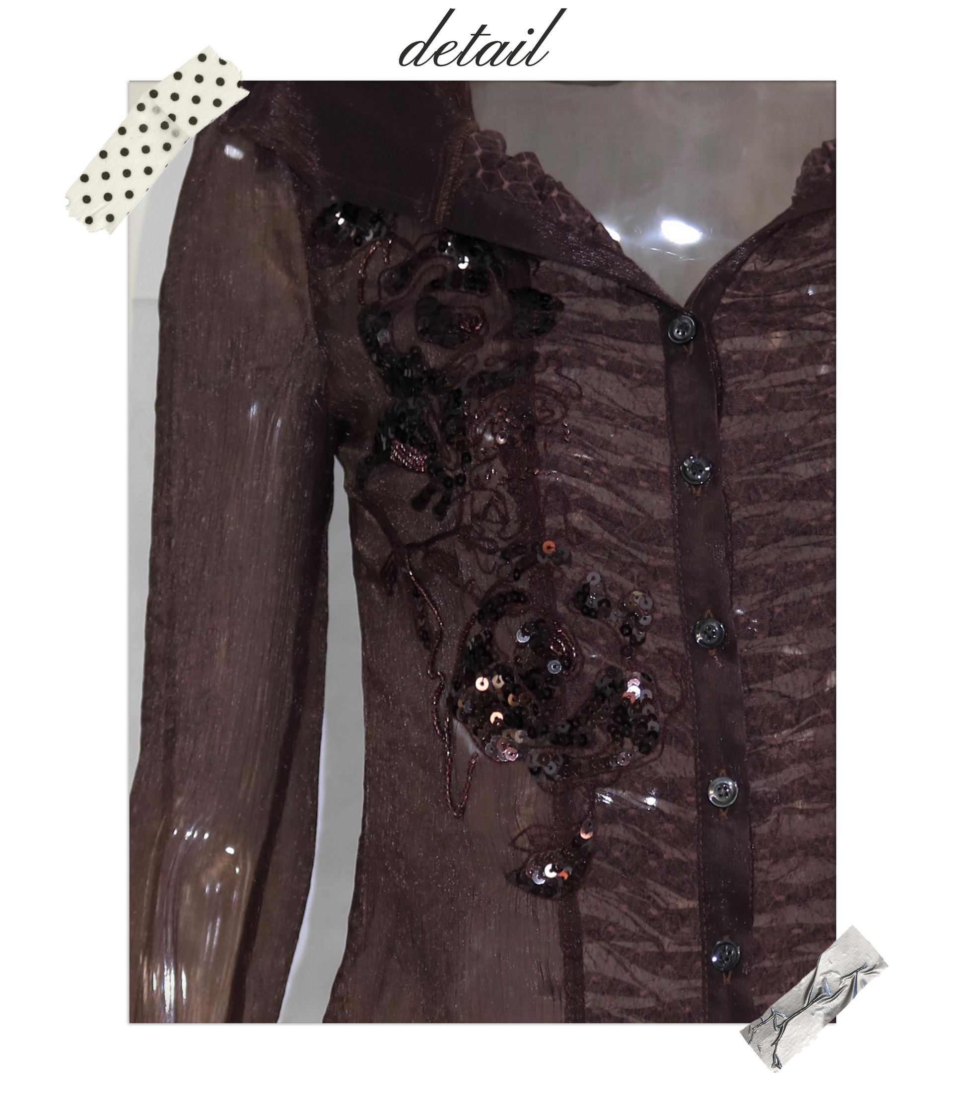 Brown Long-Sleeve Chiffon Blouse with Beaded Embroidery Panels