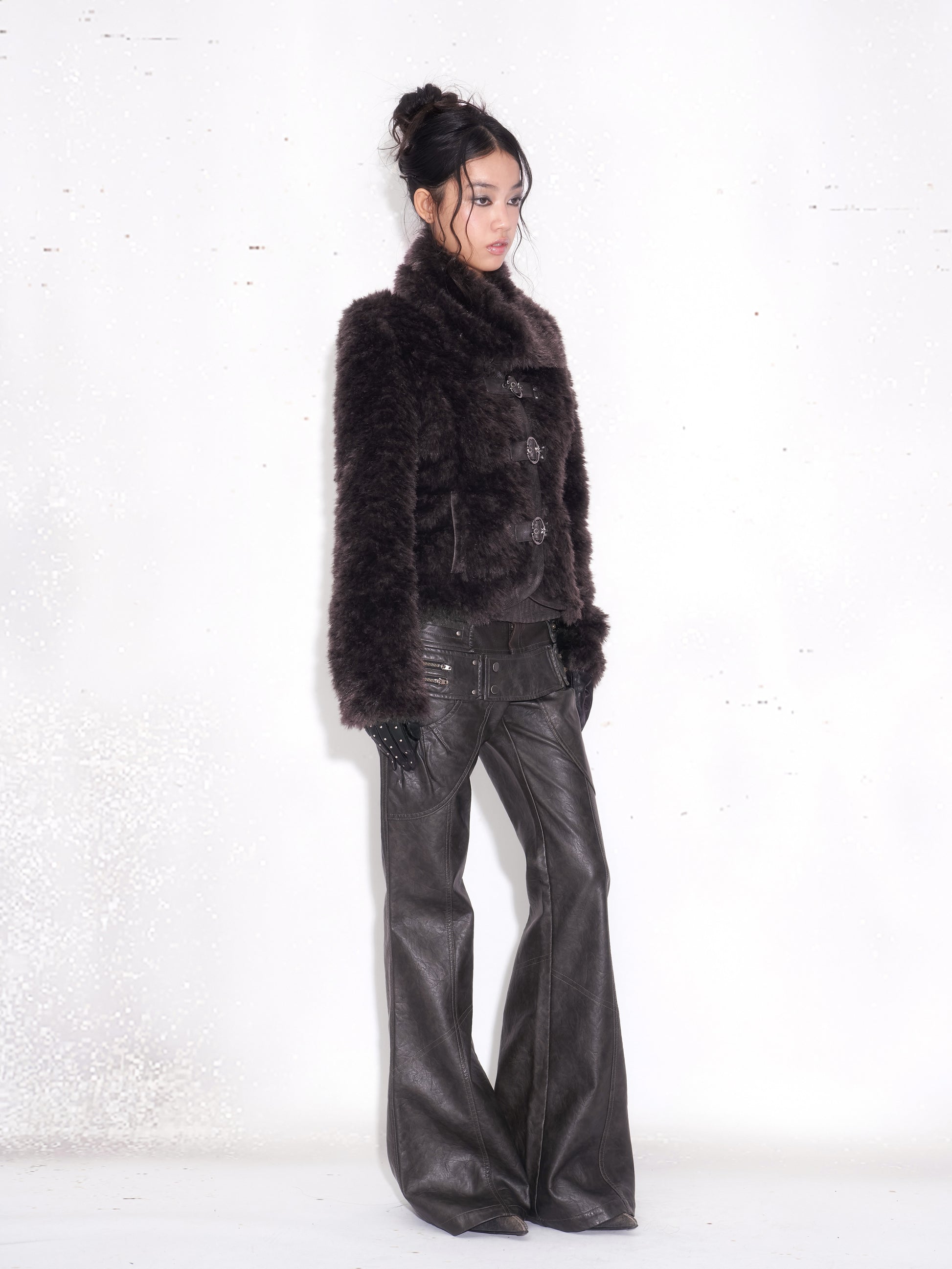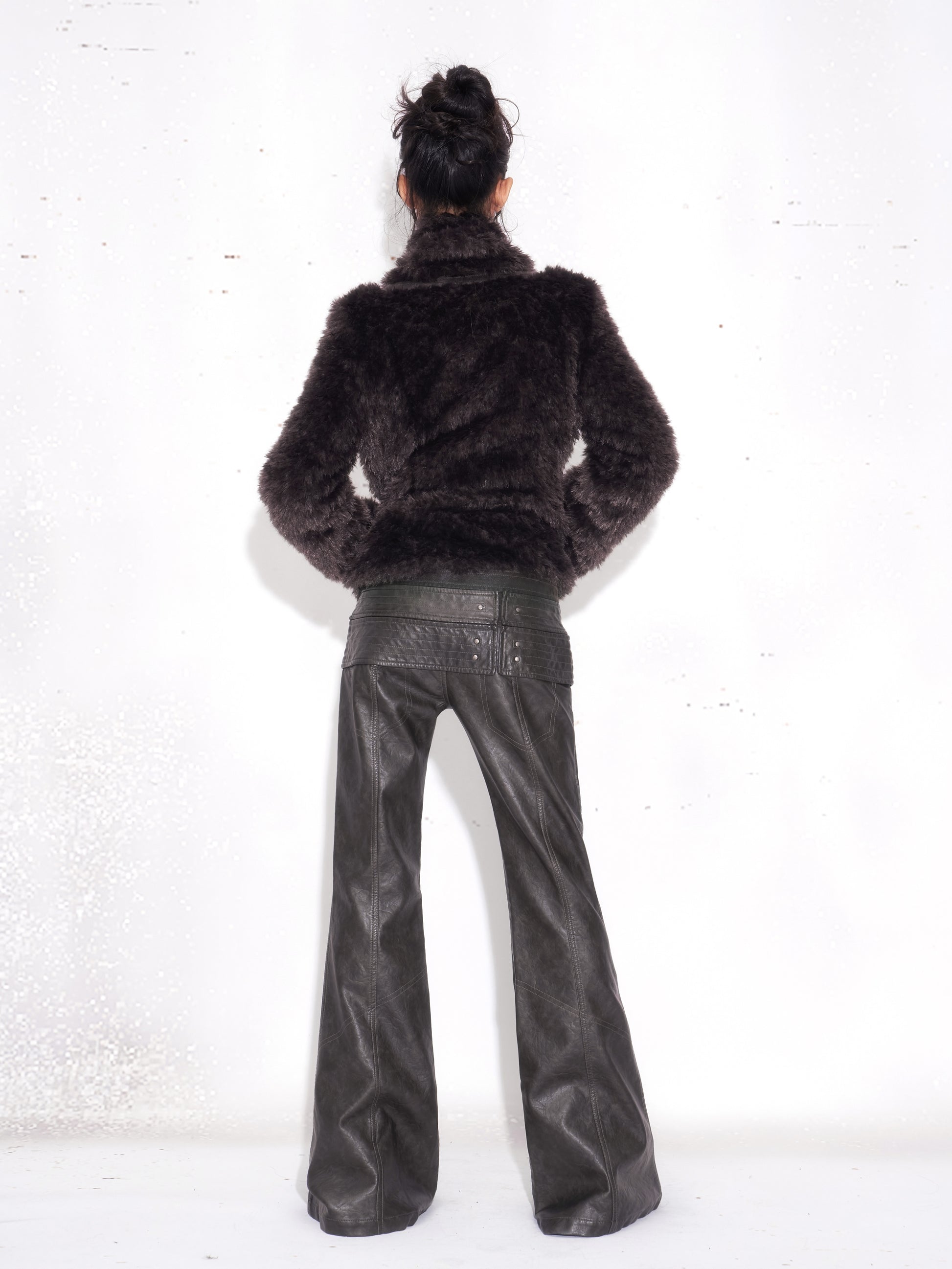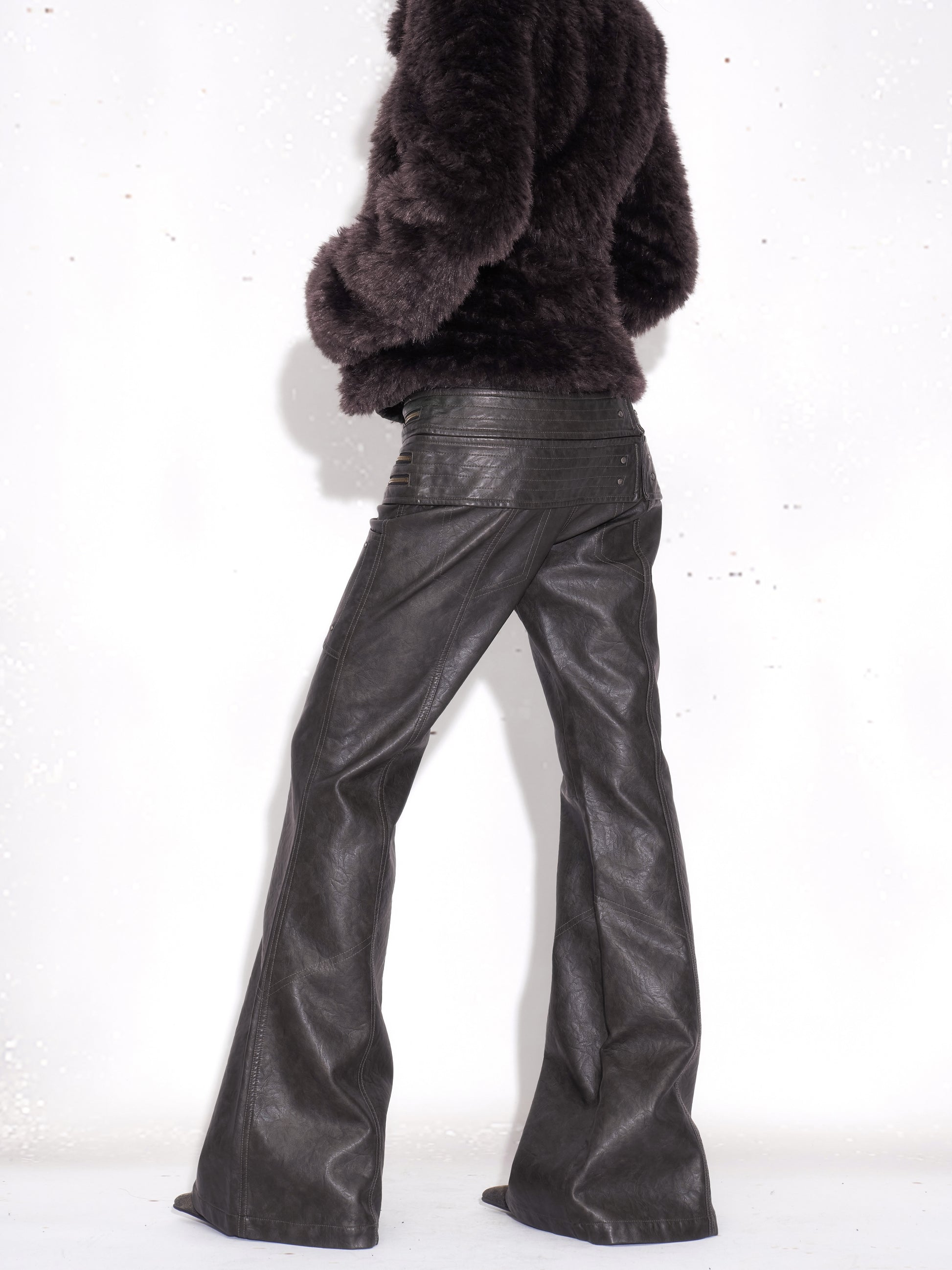 Dark Leather Zip-Detail Paneled Slim Slight Flared Pants