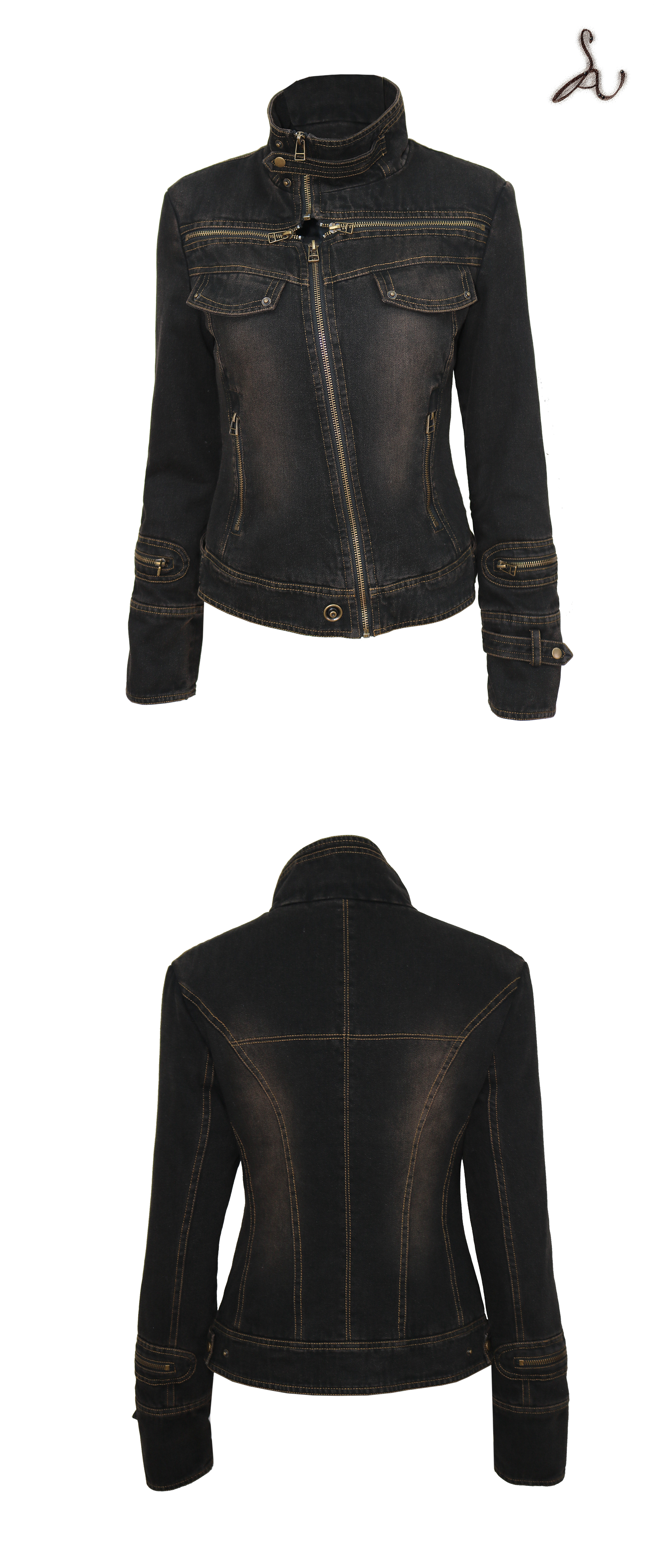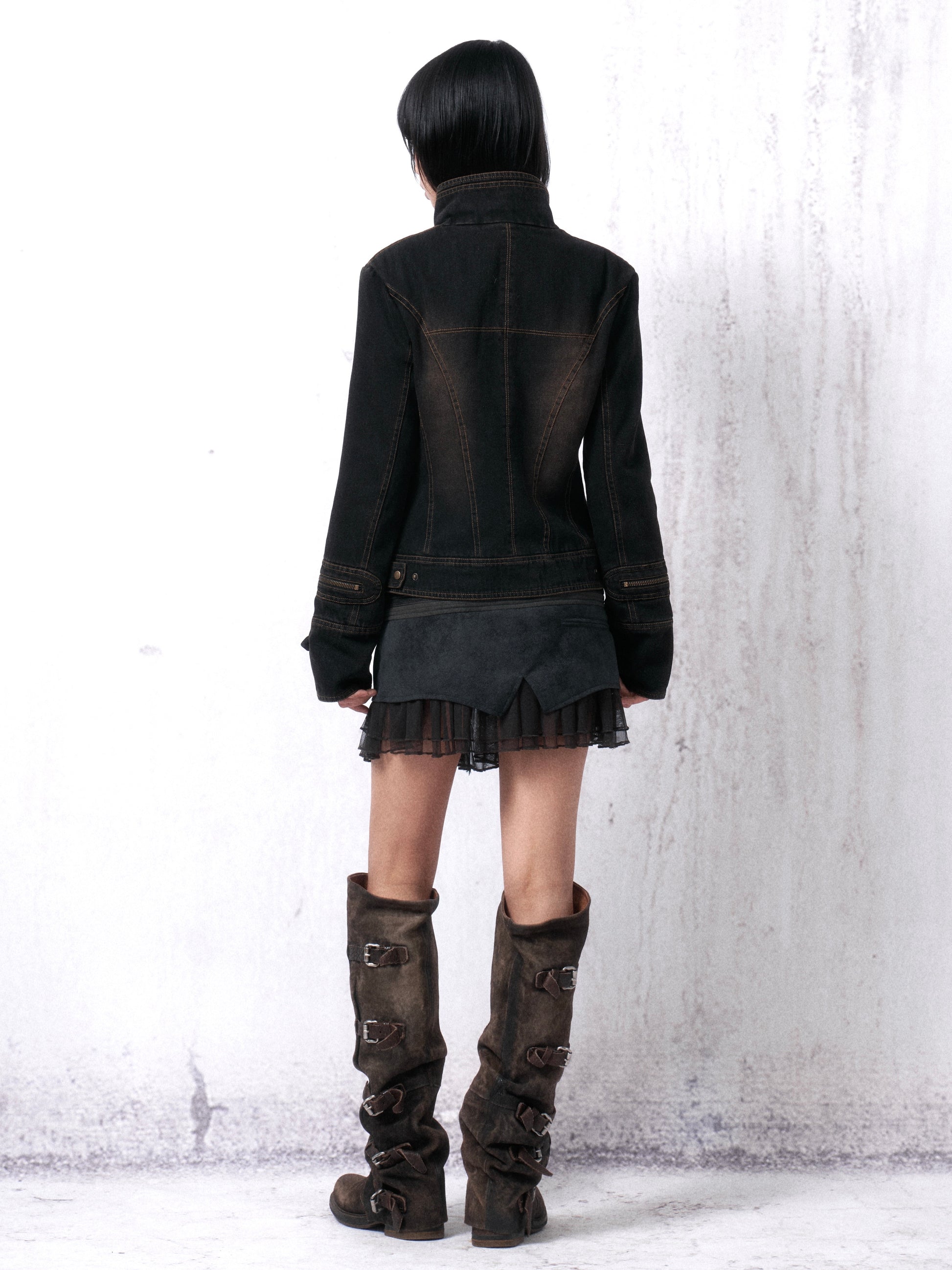Distressed Washed Denim Jacket with Cross Zip and Quilted Lining