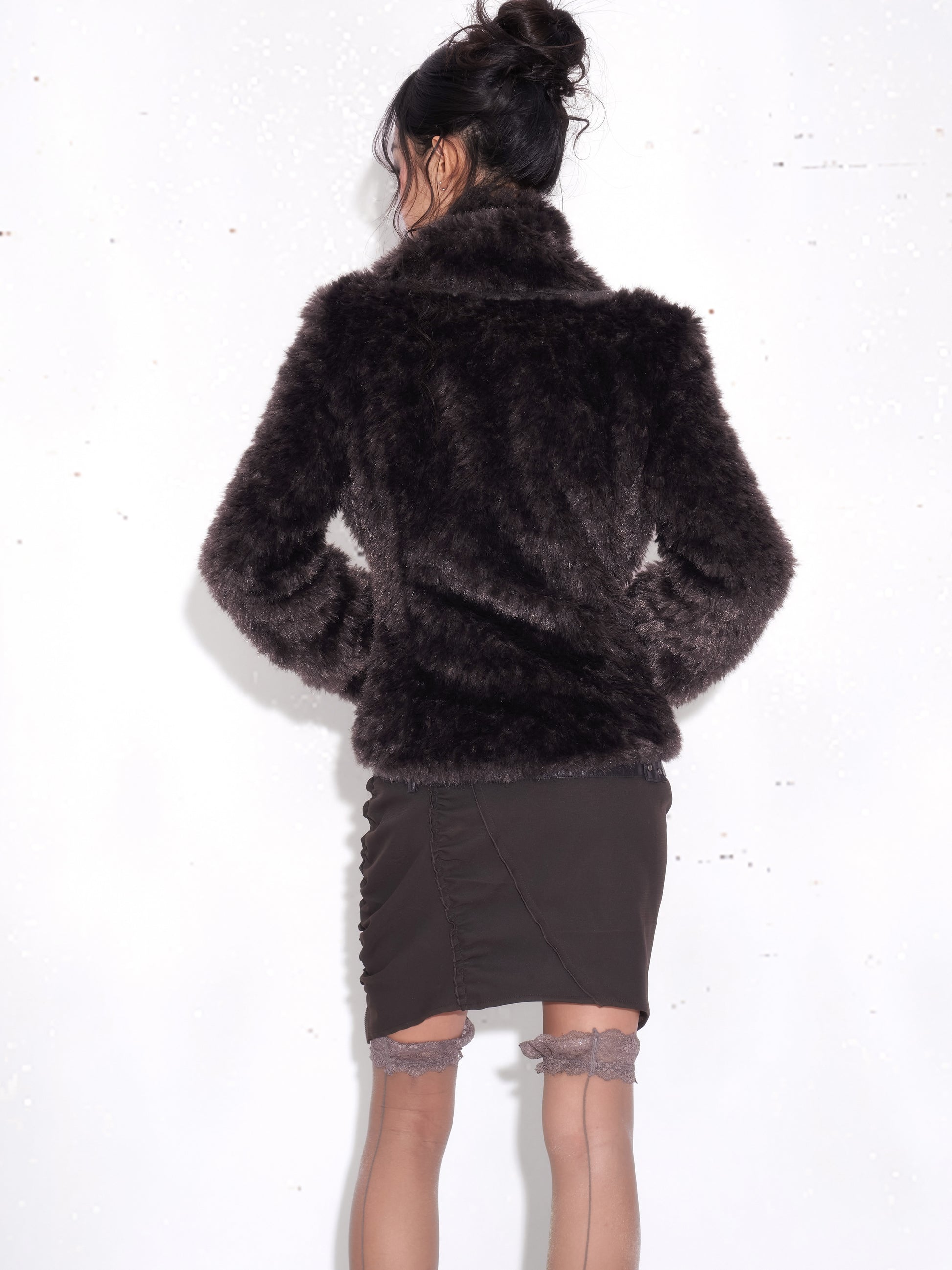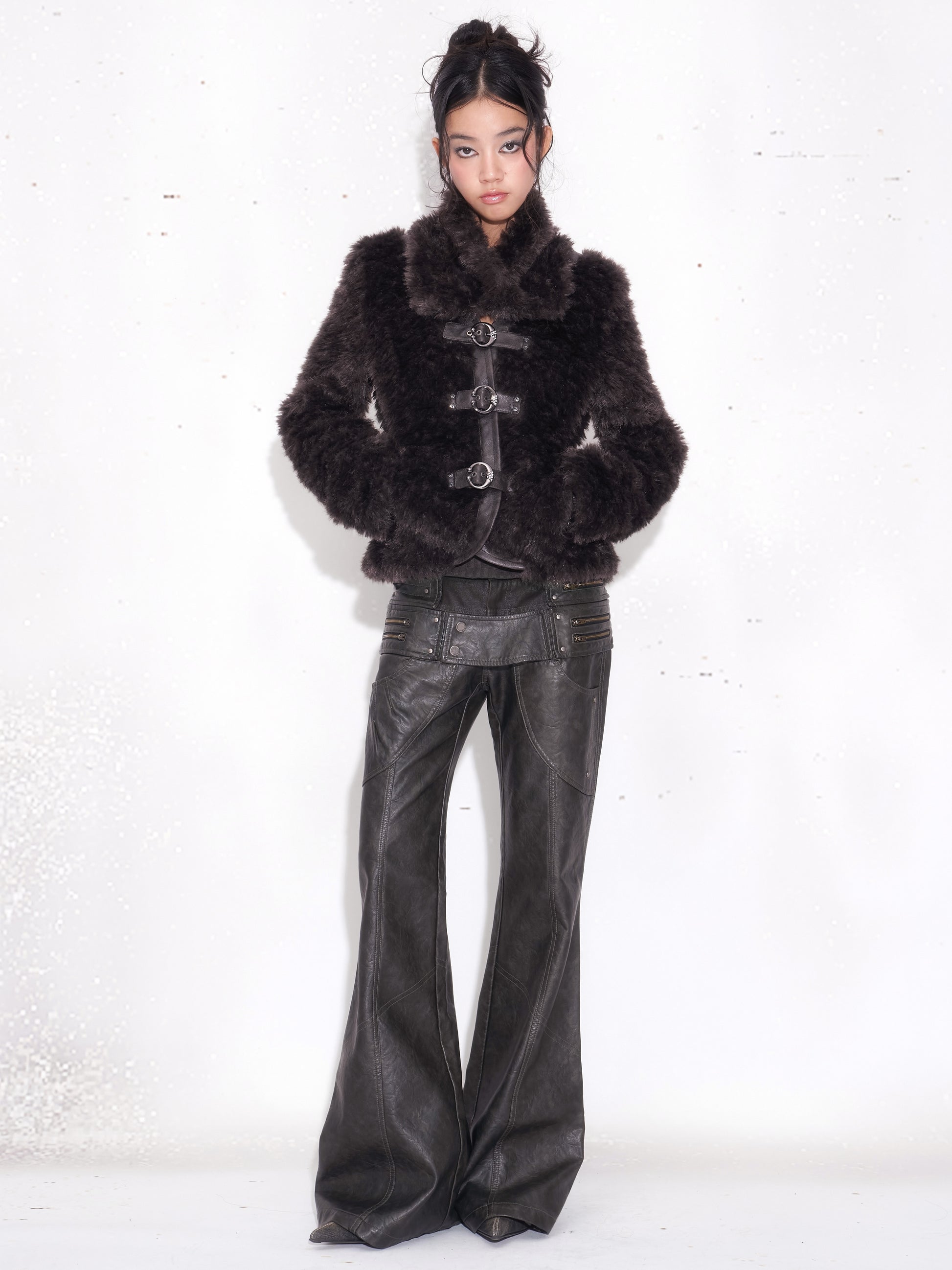 This jacket features plush, full-bodied faux fur with a soft, smooth touch. Leather trimming defines the structure, while three metal buckle straps accent the front, balancing softness with a sharp, powerful edge. The cropped length keeps the silhouette clean and sculpted for an effortlessly bold look.
