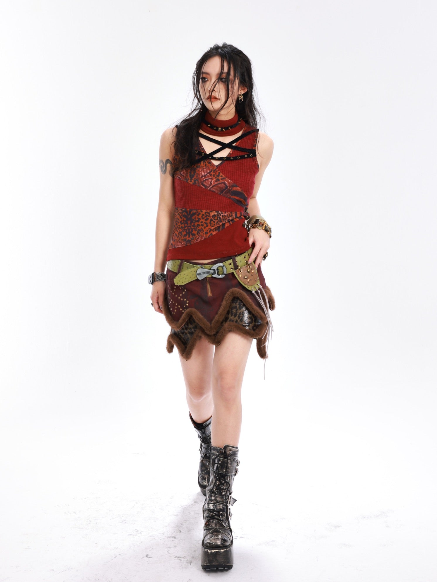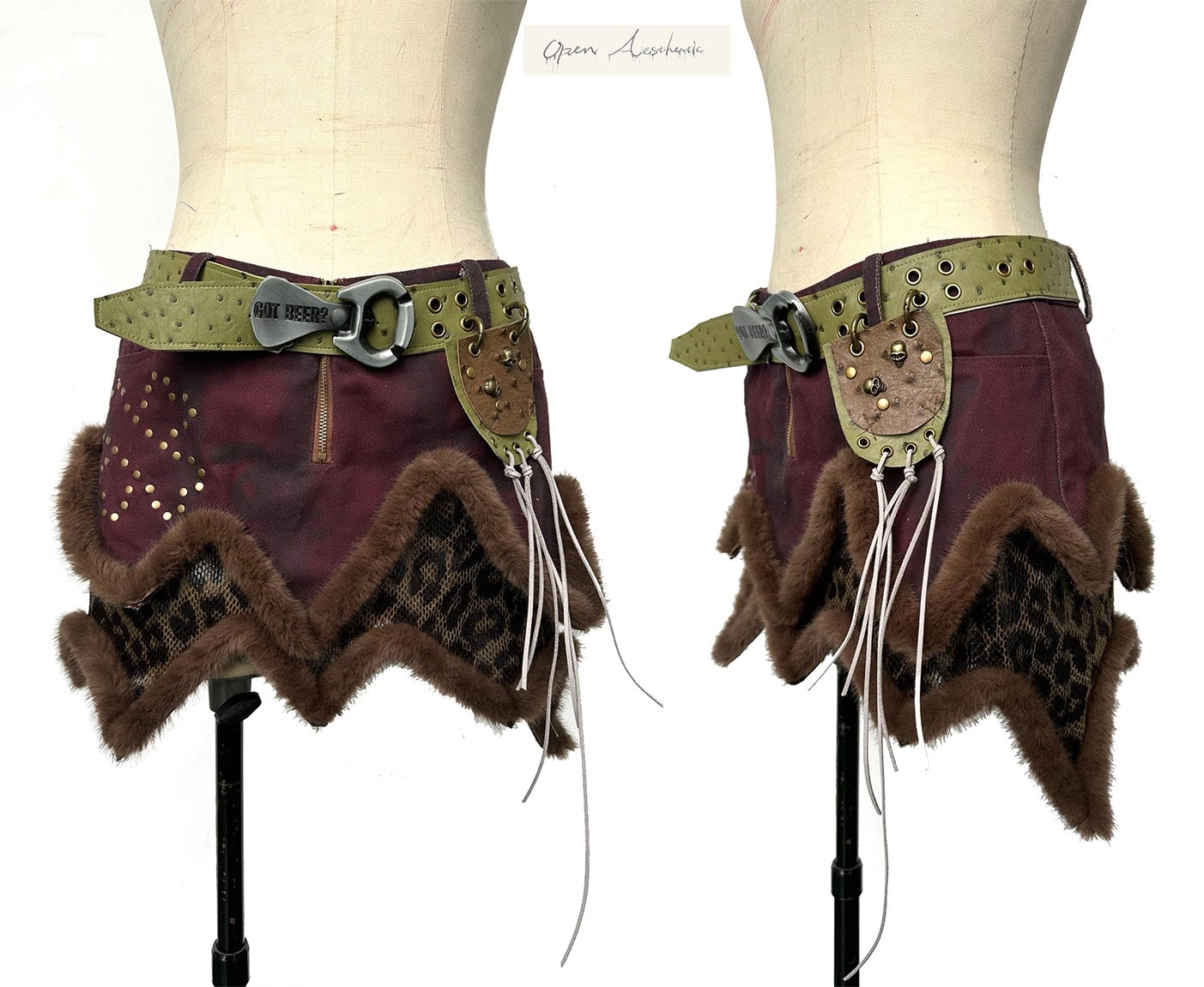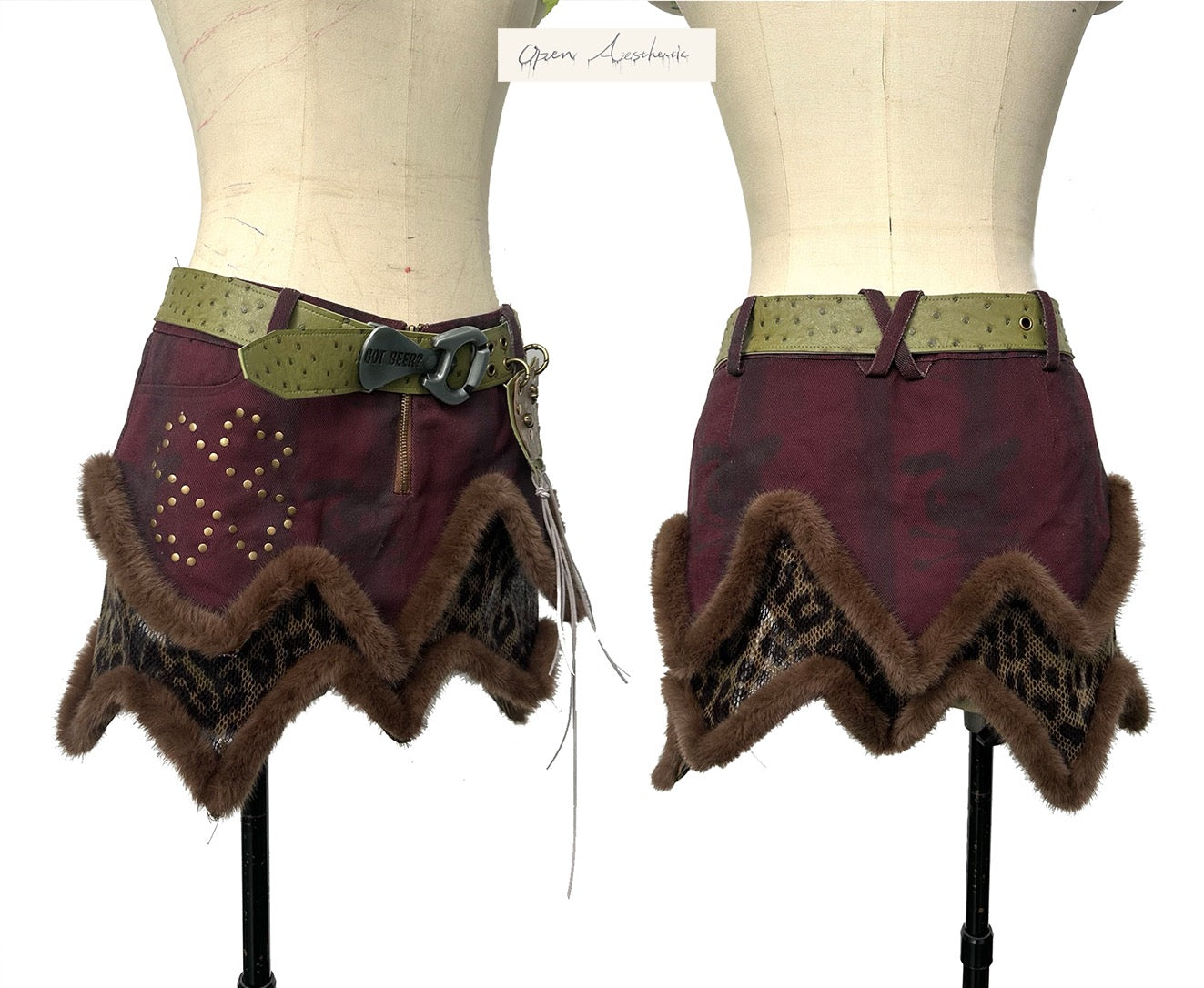 The skirt is a two-layer patchwork design with one layer of denim and one layer of faux leather. In addition, the skirt comes with a matching heavy belt, which has a detachable very delicate pendant.