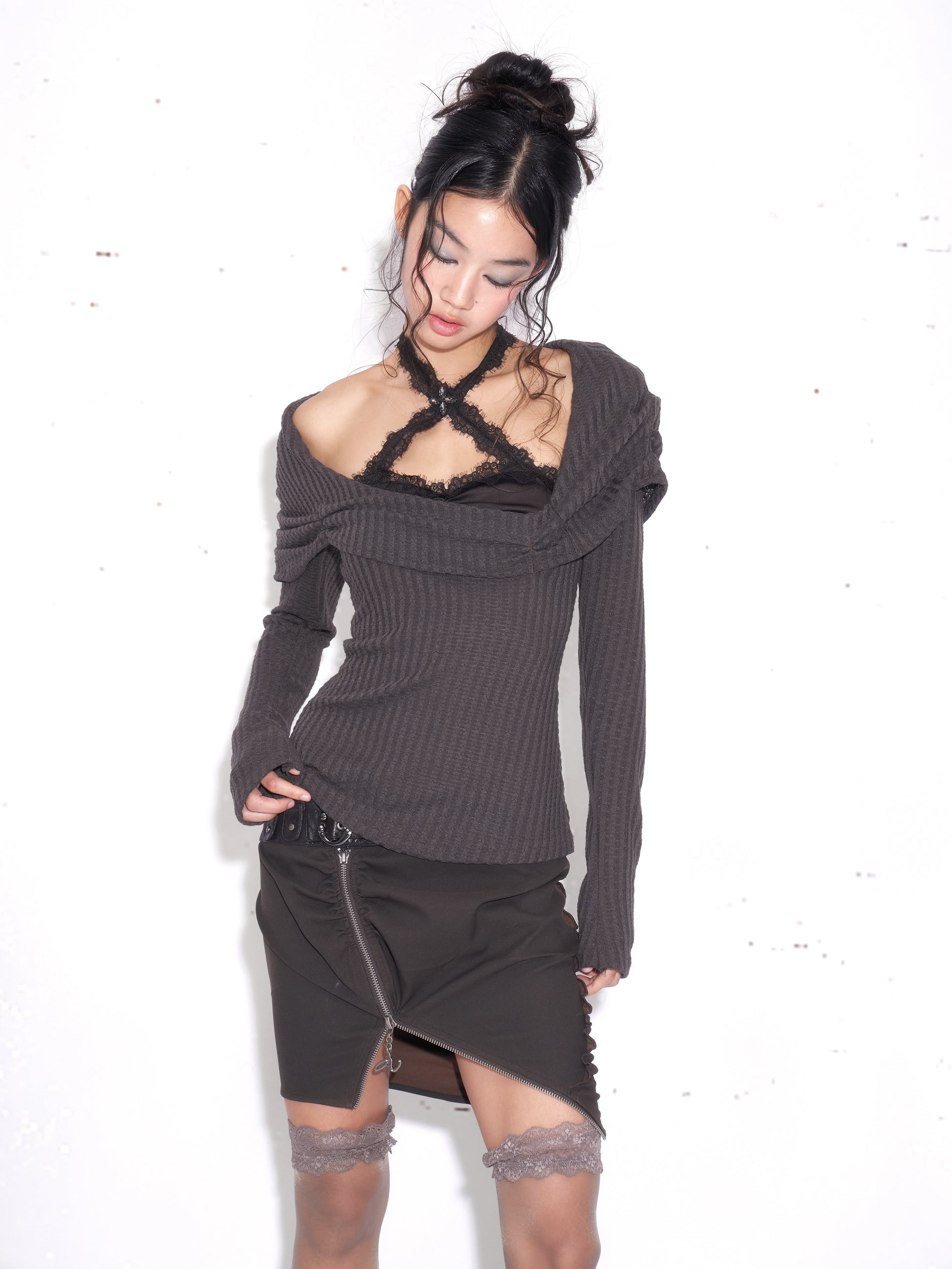This two-piece top set includes a fitted knit overlay and a lace cross-halter bralette. The knit layer features a fine-textured construction that contours the body’s curves, while the bralette’s lace design frames the collarbone with subtle, understated sensuality. The wide lapel drapes naturally or can be worn loosely over the shoulders, shifting the mood with every movement.
