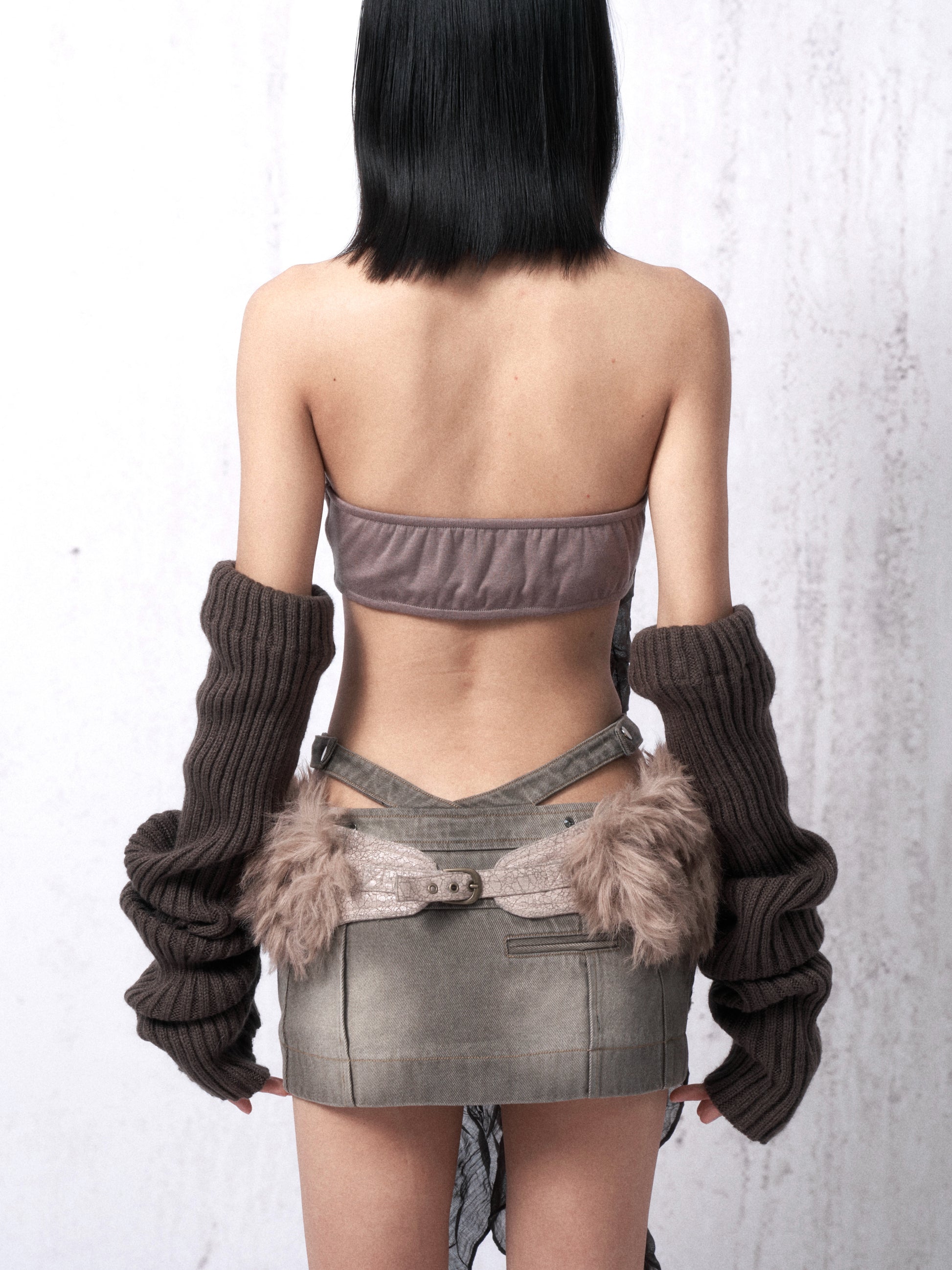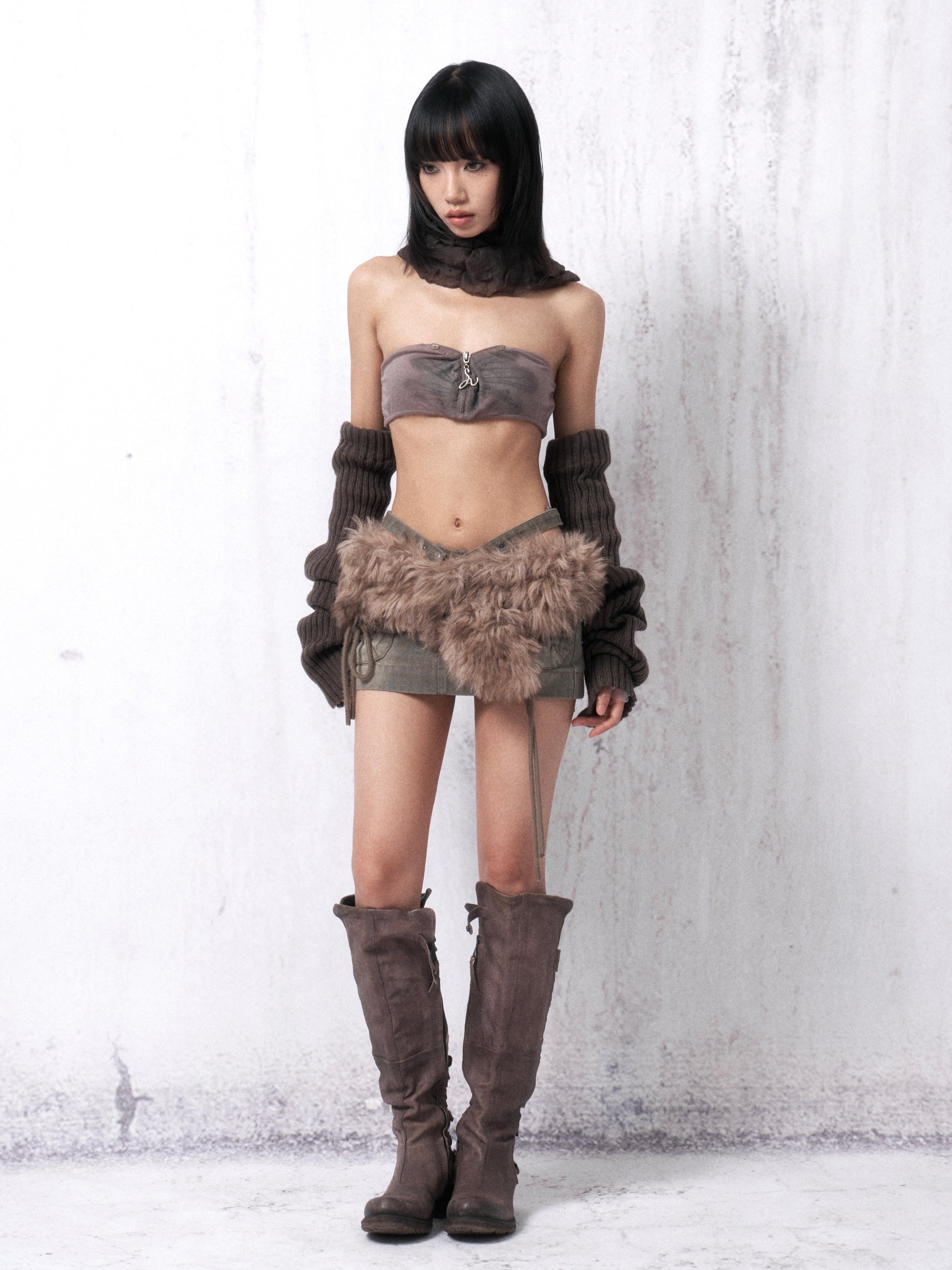 This two-piece set includes a printed corset top with an adjustable zip and a stretch knit overshirt.