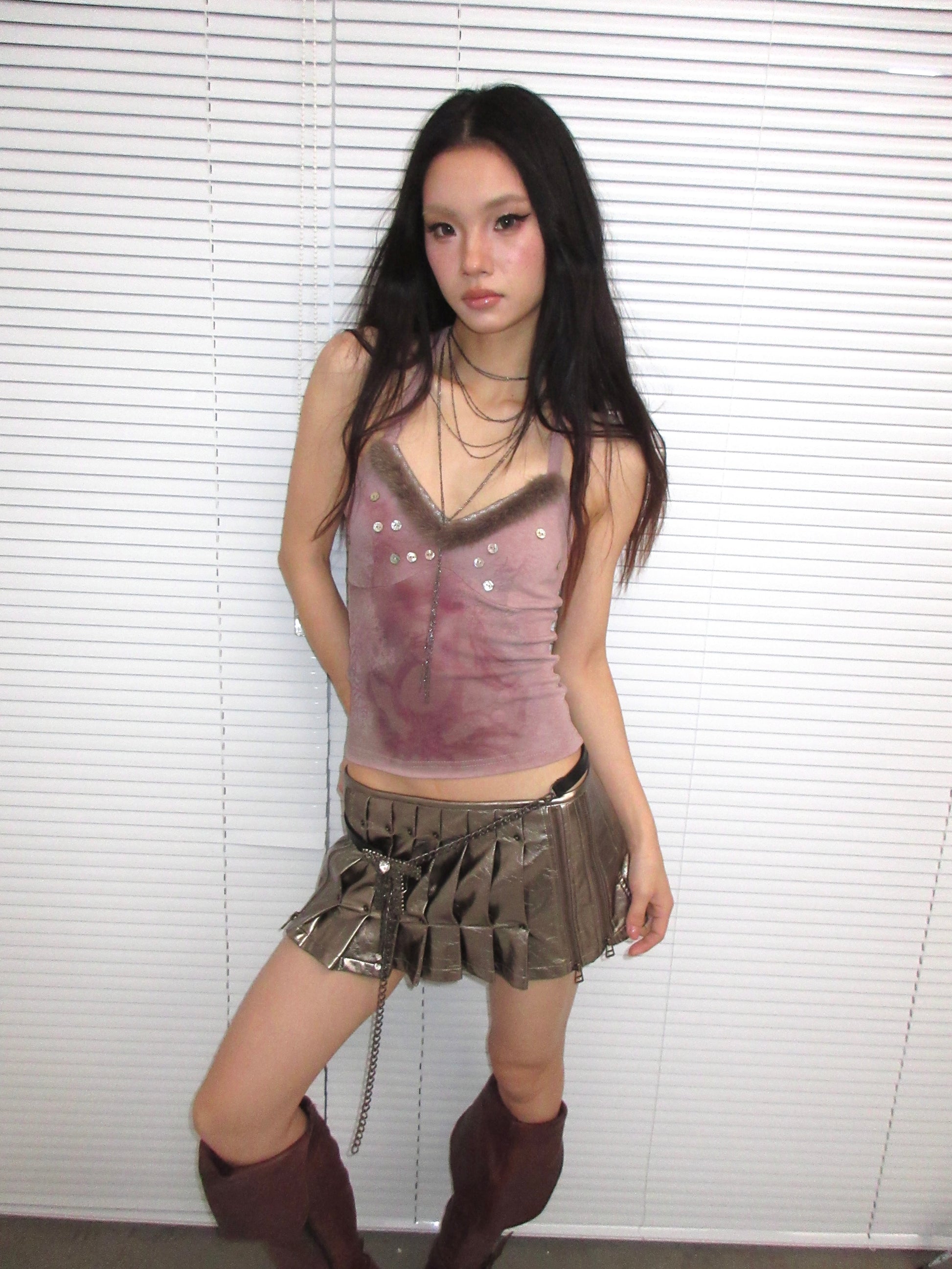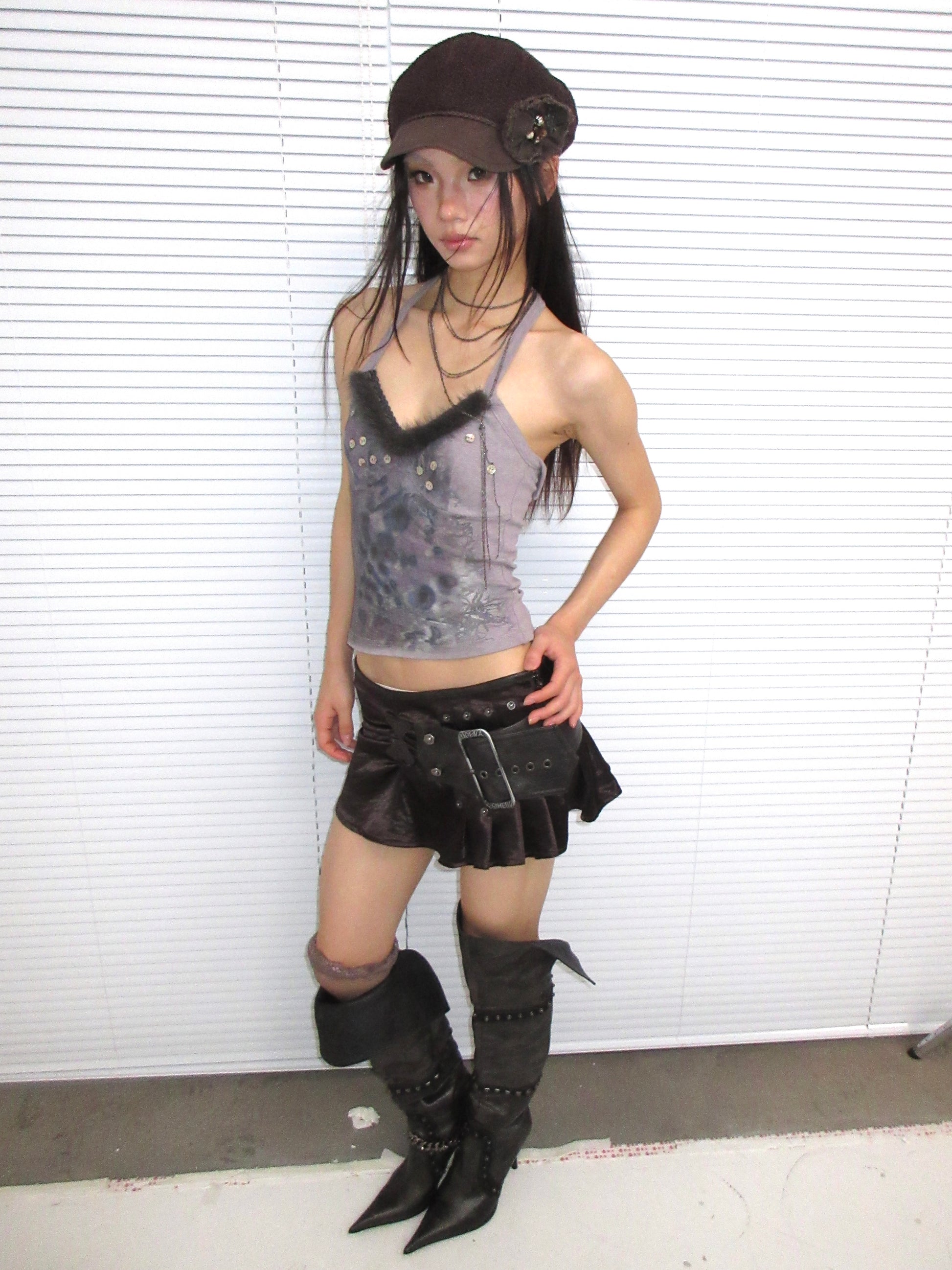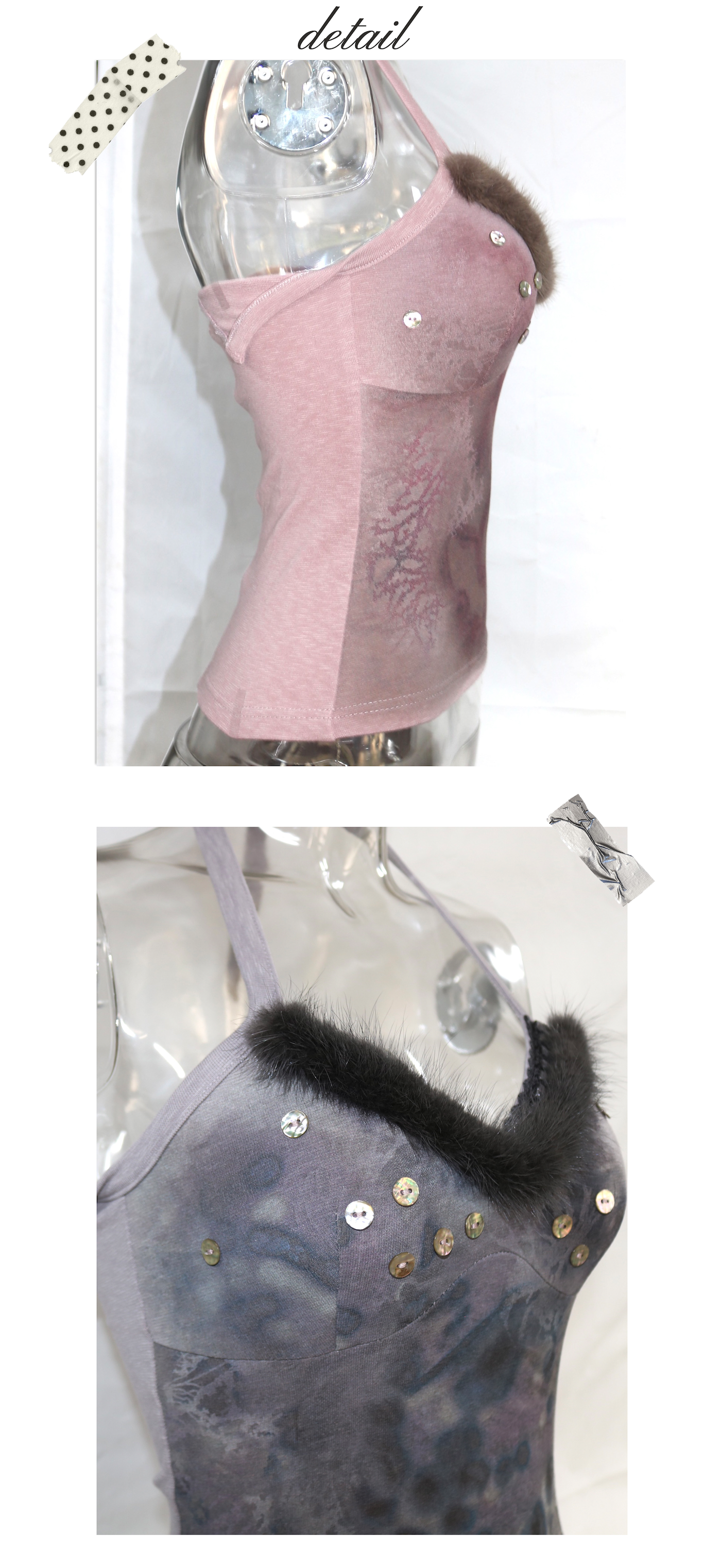 This top is made from a soft, stretchy knit fabric. It features a collar with fur and lace paneling, and is adorned with exquisite button accents at the chest.