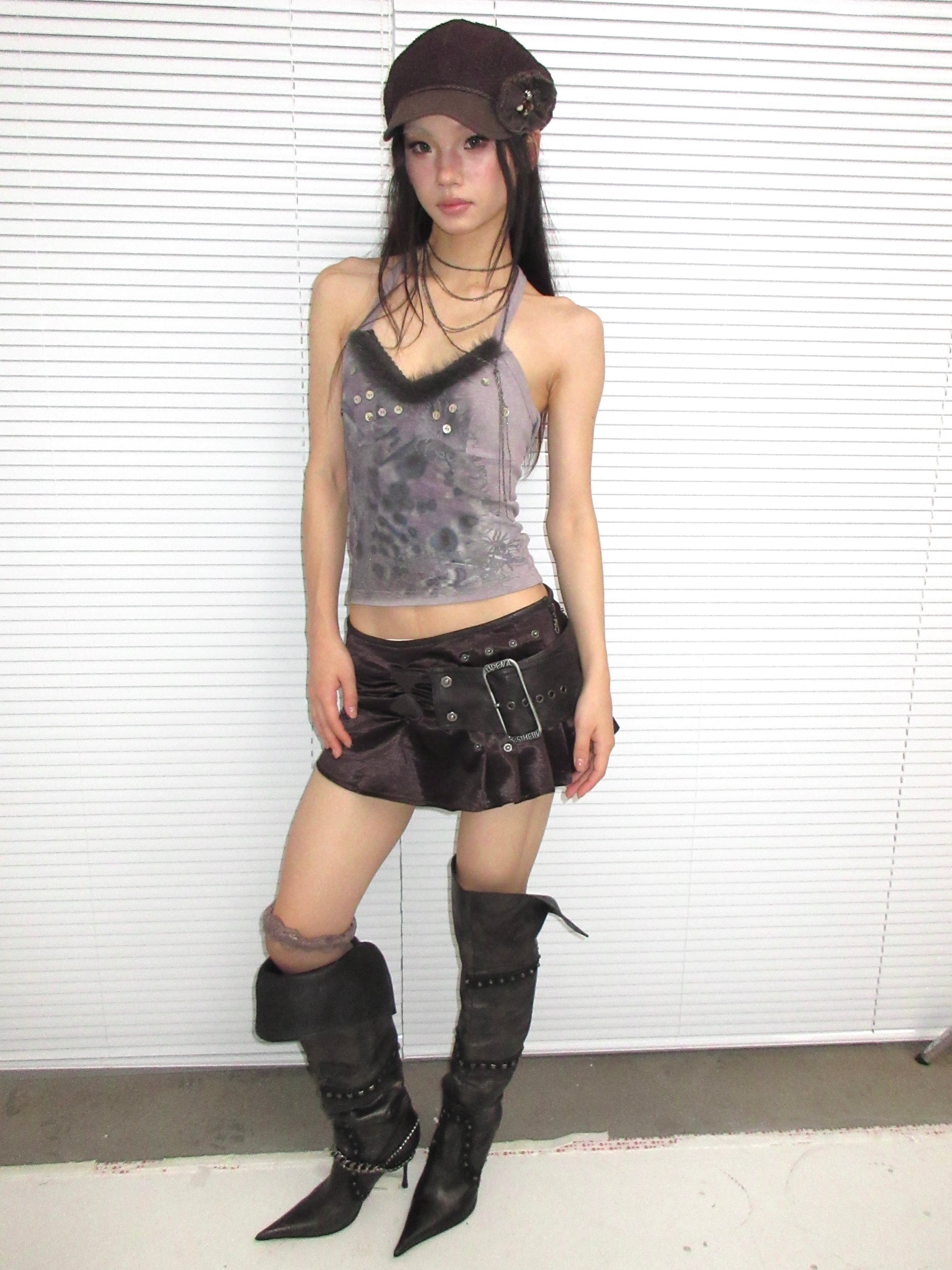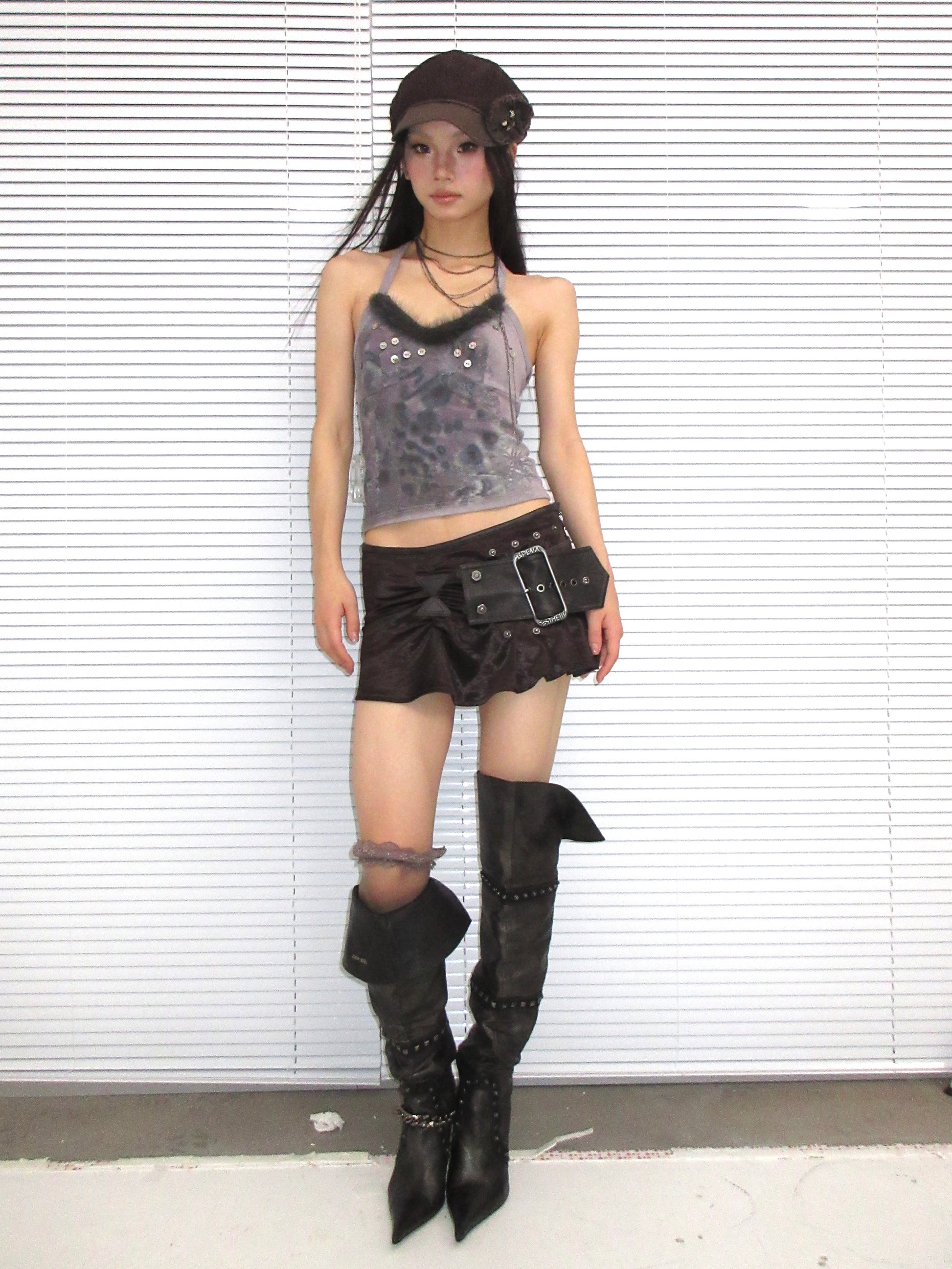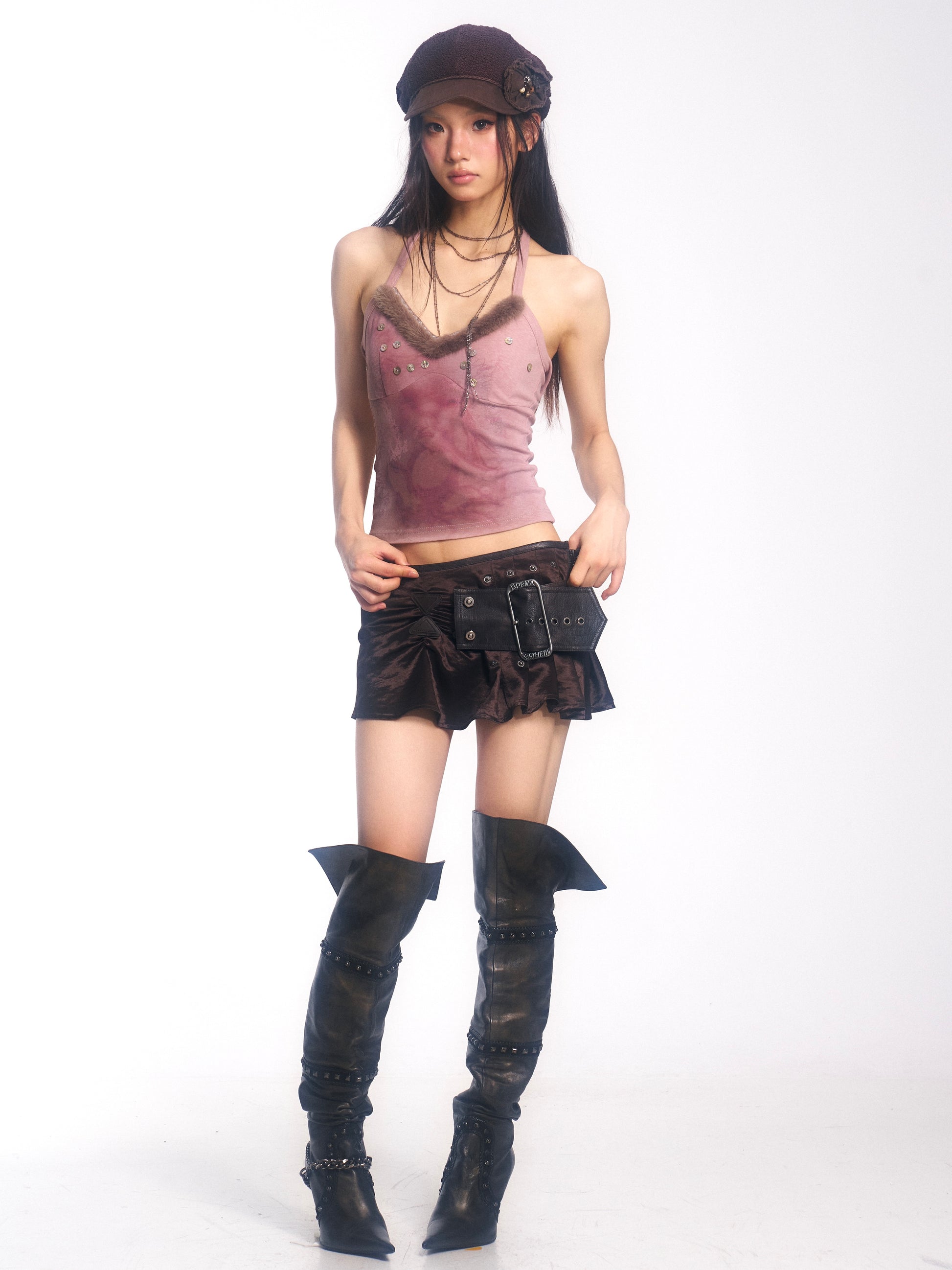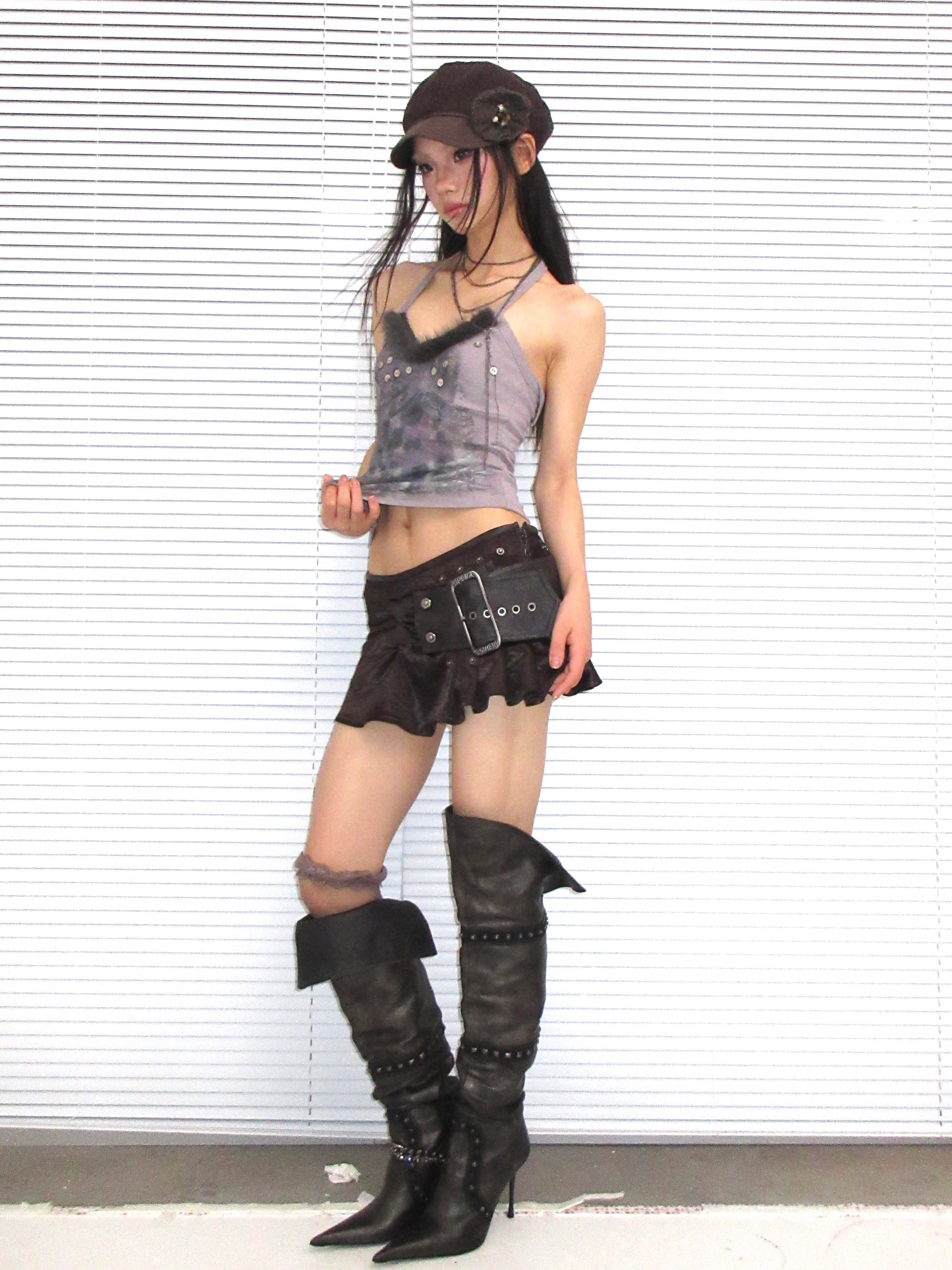 This top is made from a soft, stretchy knit fabric. It features a collar with fur and lace paneling, and is adorned with exquisite button accents at the chest.