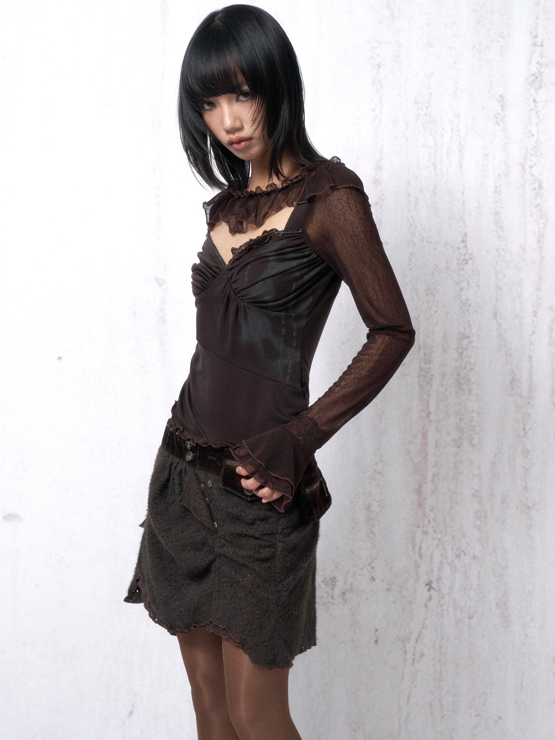 This top combines soft, stretchy knit fabric with lace paneling. It features a distinctive cascade collar design, complemented by delicate ruching and printed patterns throughout the garment for a structured silhouette.