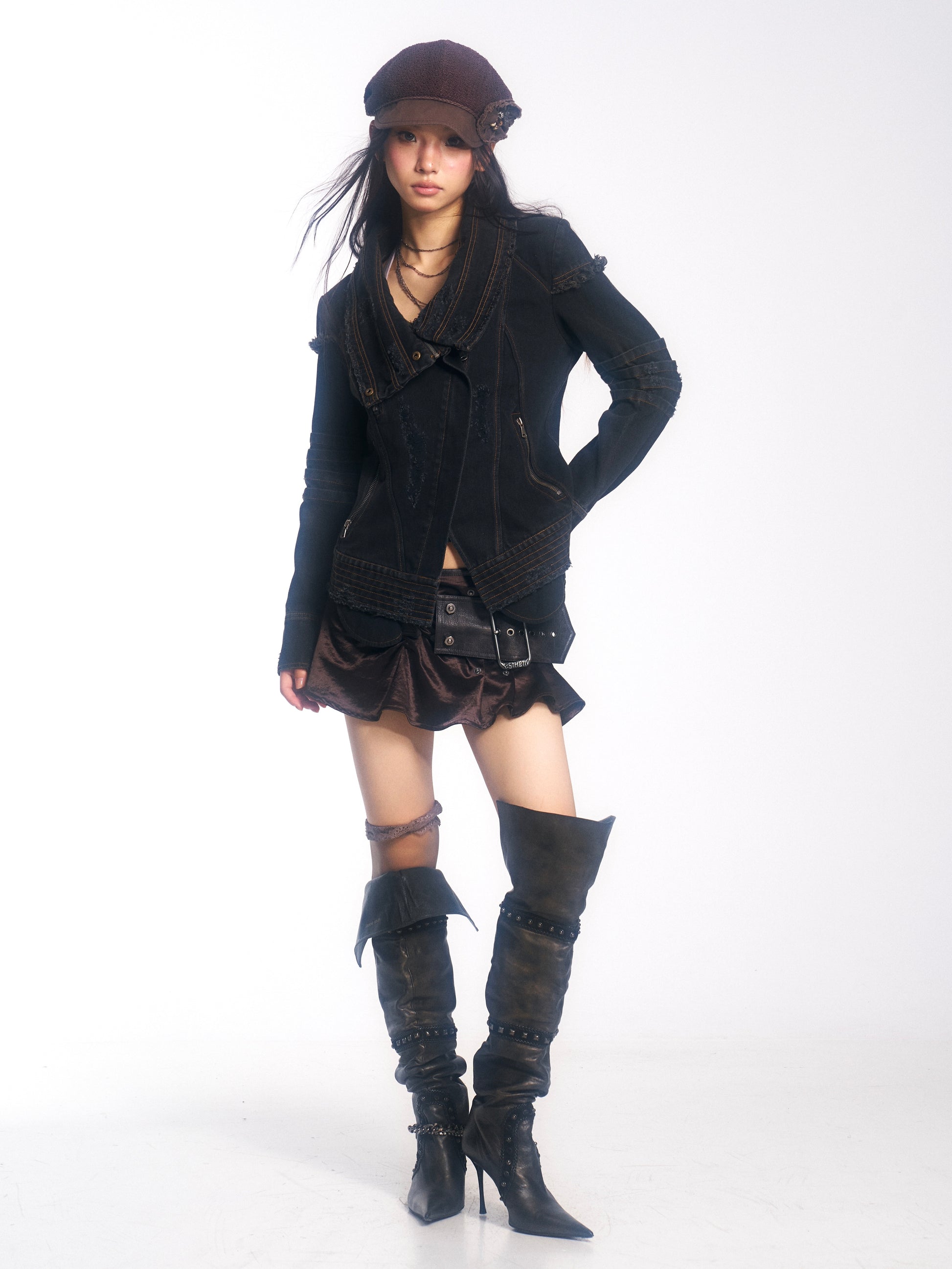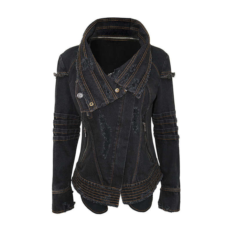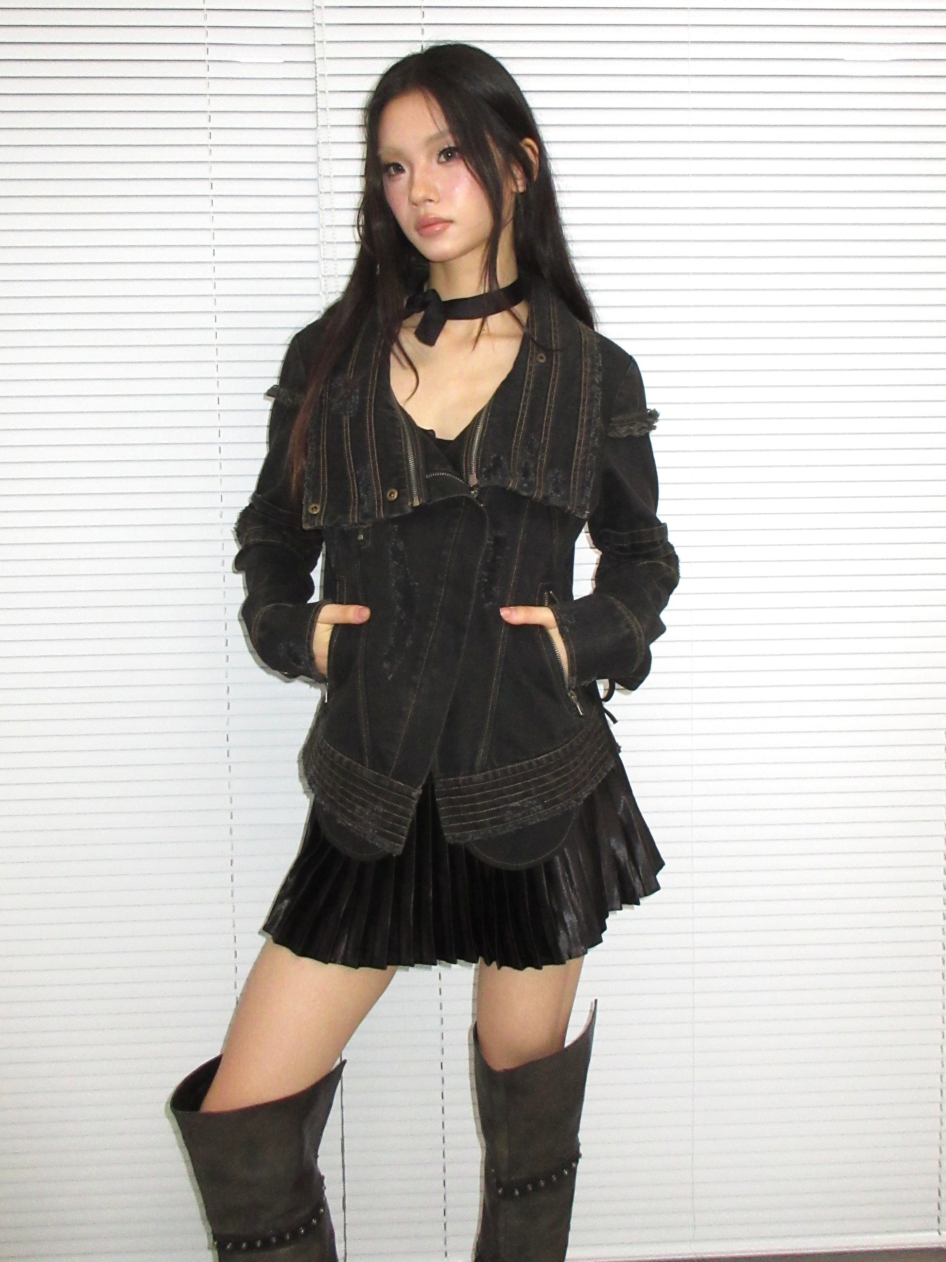 Punk-Style Heavy-Duty Washed Denim Jacket with Vintage Collar & Destroyed Details