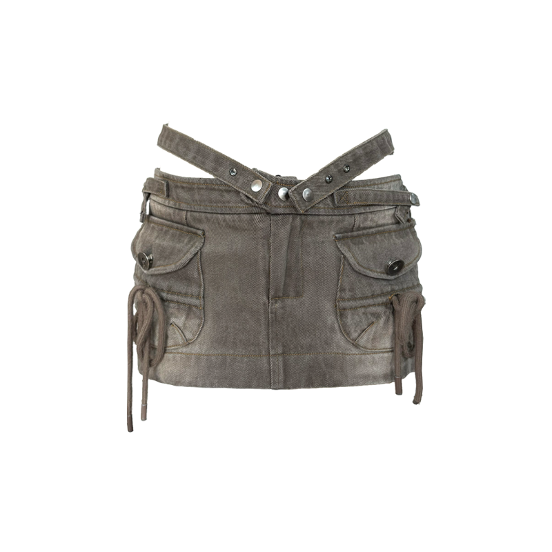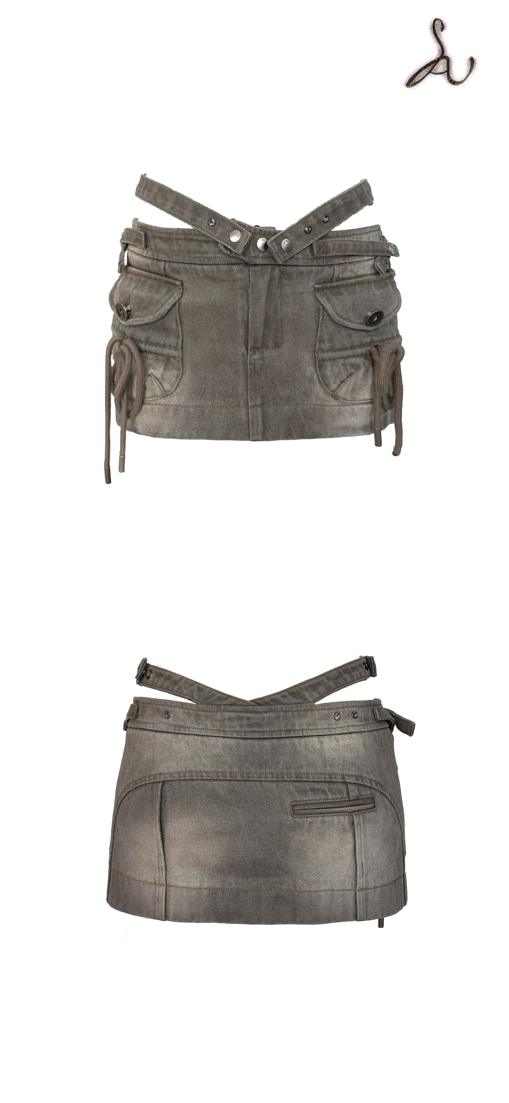 This denim skort features built-in shorts for coverage and is crafted from washed, distressed fabric for a utility-inspired look. The waistband is adorned with delicate crystal embellishments.