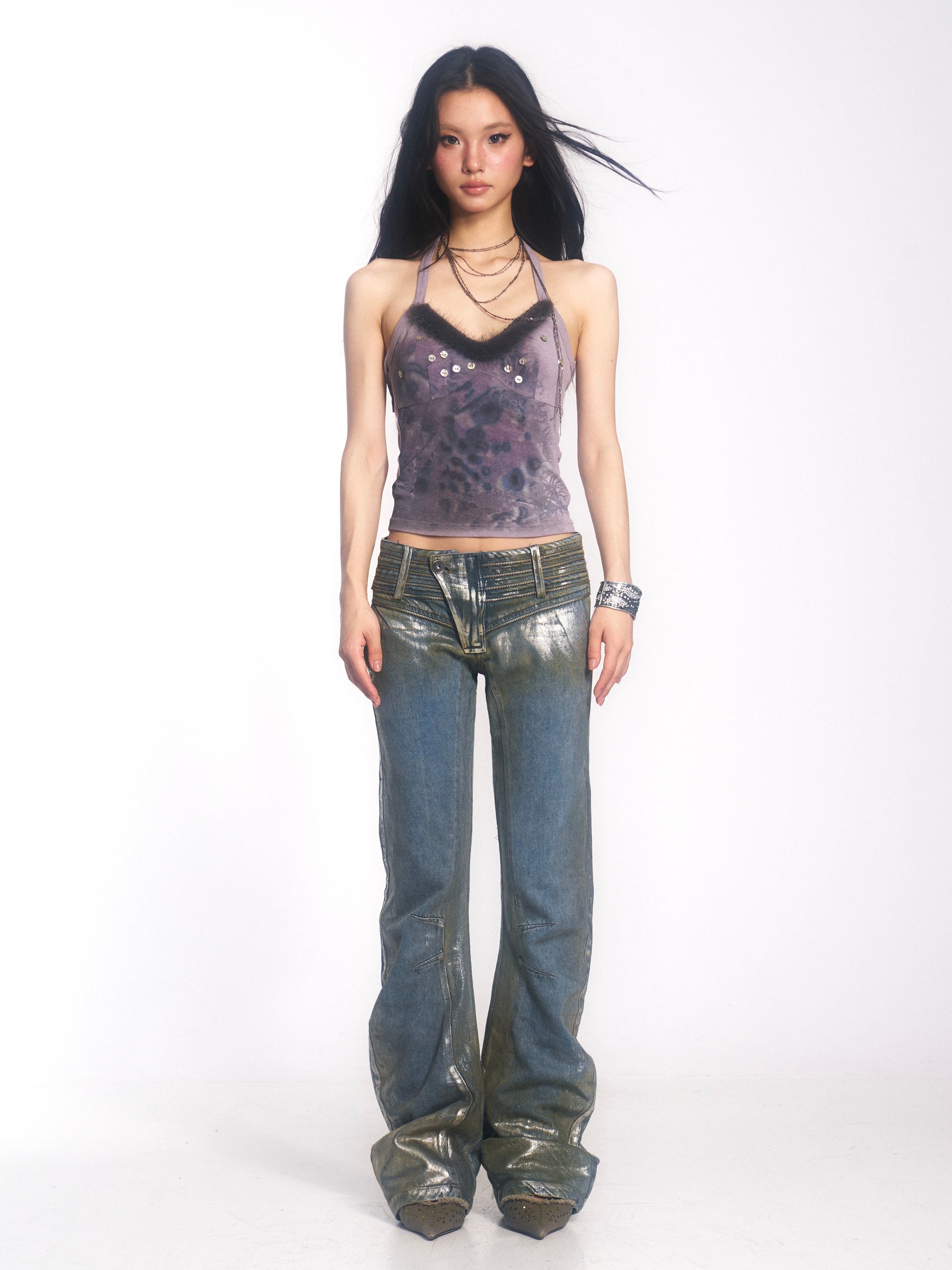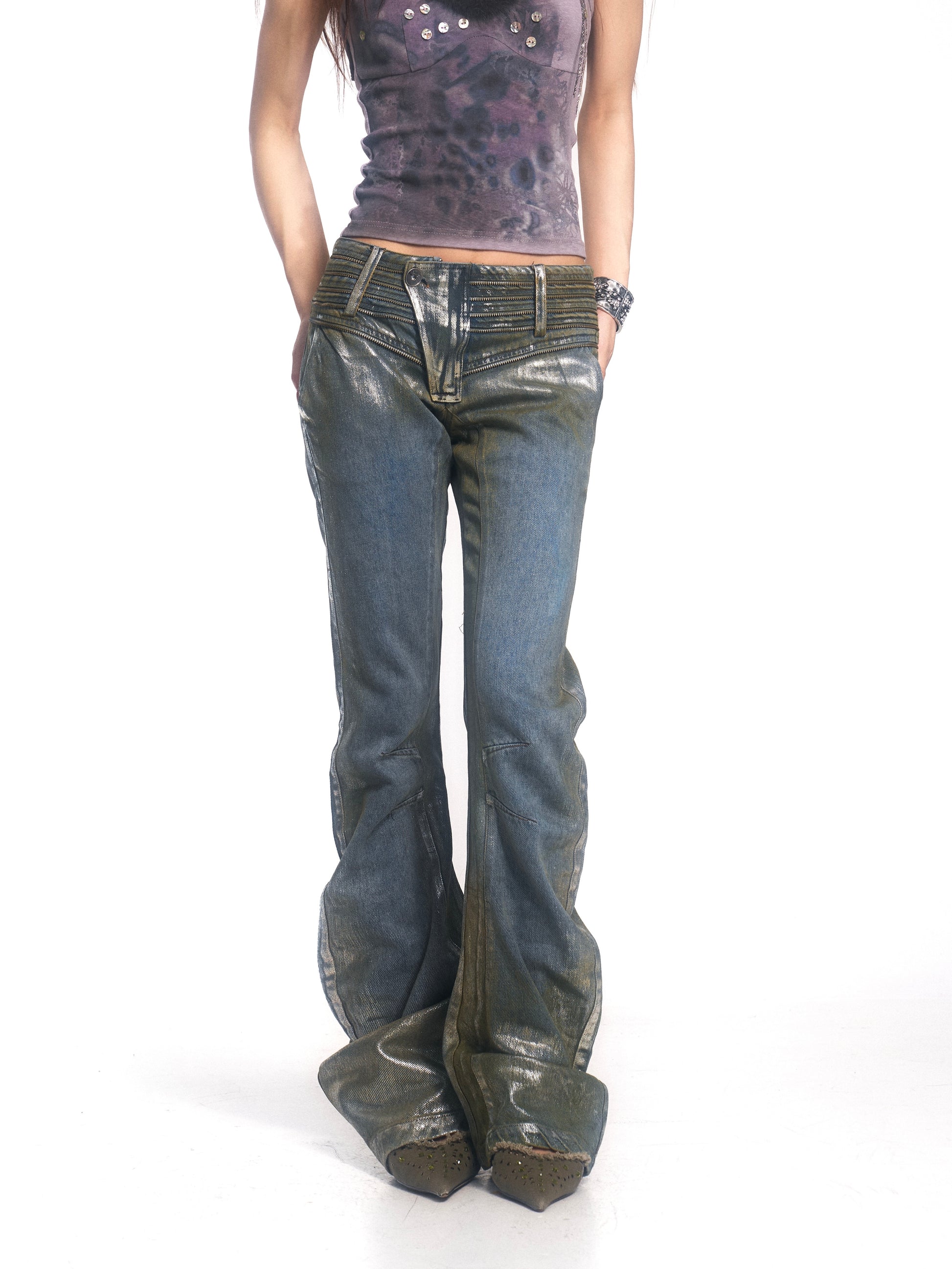 Vintage Washed Denim Jeans with Silver Foil & Curved Hem